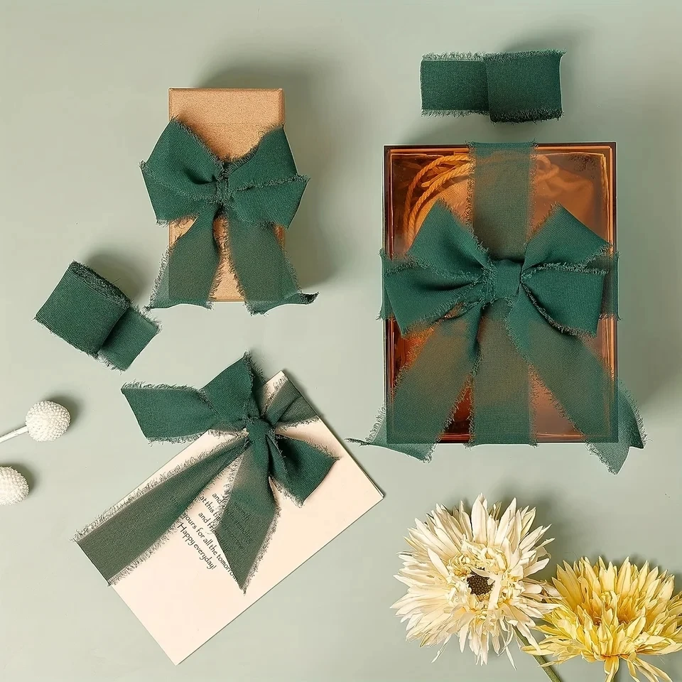 3 Rolls of 5M Chiffon Black Green Frays Ribbon Holiday Gift Wedding Invitation Box Ties,Bouquet Wrapping DIY Material